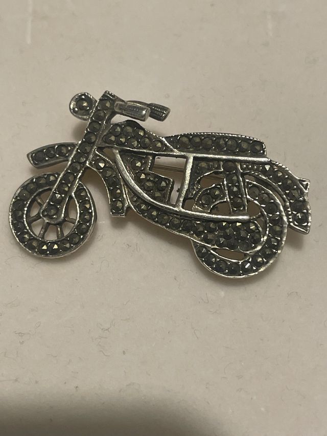 Spilla a forma di motocicletta, impreziosita da numerose pietre scure, interamente in argento 925.