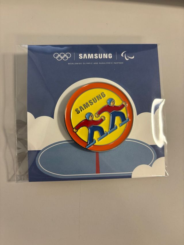 Dettagli del prodottoSpilla commemorativa Samsung, partner olimpico e paralimpico. Raffigura due pattinatori stilizzati su sfondo giallo e arancione.