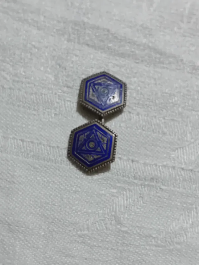 Dettagli del prodottoSpilla vintage con design esagonale e smalto blu. Un accessorio unico per arricchire il tuo stile.