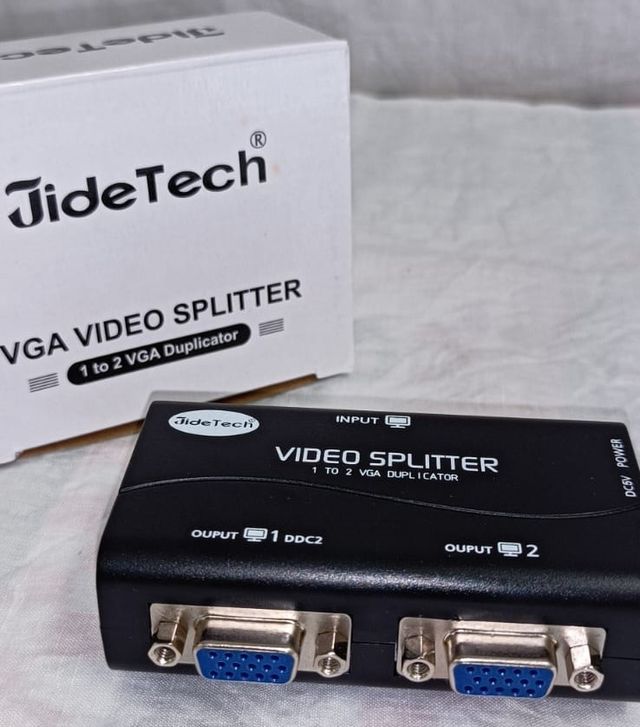 Dettagli del prodottoSplitter video VGA JideTech per duplicare il segnale su due uscite.