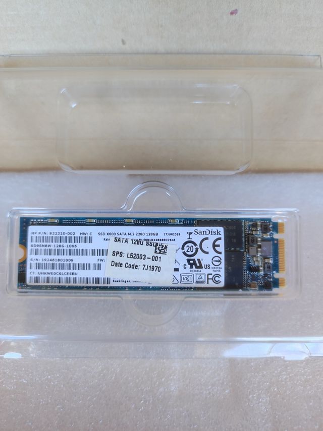 SSD (Solid State Drive) SanDisk SATA da 128 GB in formato M.2. Questo tipo di unità di archiviazione è comunemente utilizzato nei computer portatili e in alcuni desktop come memoria principale per il sistema operativo e le applicazioni, offrendo velocità di lettura e scrittura superiori rispetto ai tradizionali hard disk meccanici.