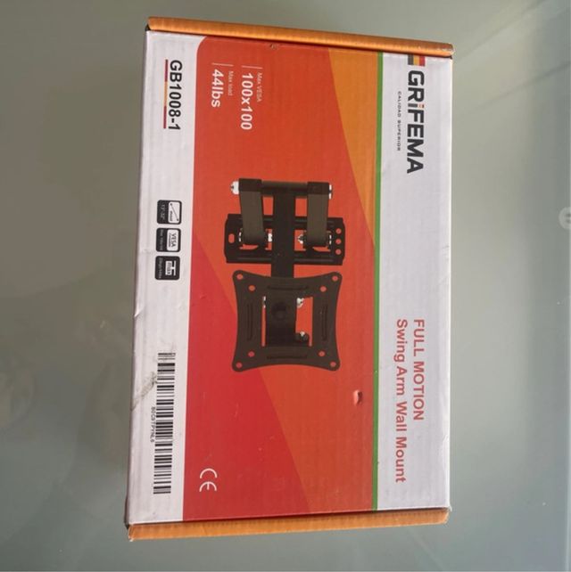 Supporto da parete per TV GRIFEMA, modello GB1008-1. Perfetto stato. - Supporta TV fino a 44lbs (20kg). - VESA 100x100. - Braccio girevole.