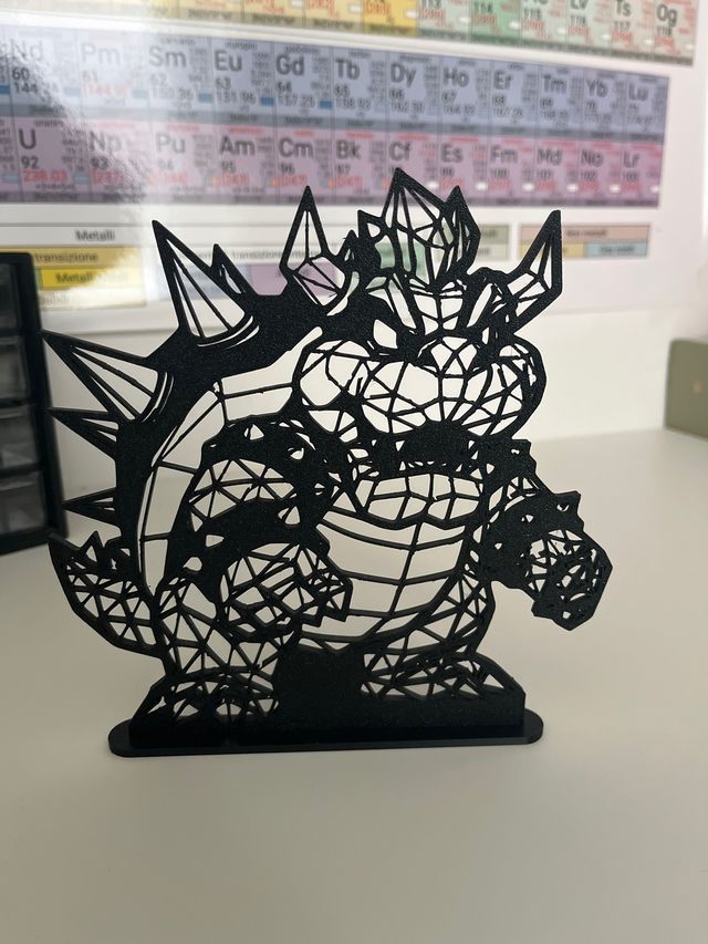 stampa 3D nera di Bowser in plastica con supporto. misure stampa in cm: 16x16 misure supporto in cm: 13x1