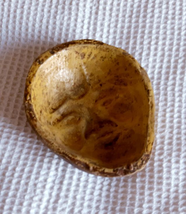Questa antica formina o formella di 13 cm circa raffigura il volto di un santo.