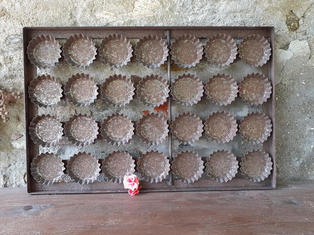 Stampo vintage per la preparazione di tartellette. - Realizzato in metallo. - Dispone di 24 stampini individuali. Misure 58,5x39x2,5 art 39