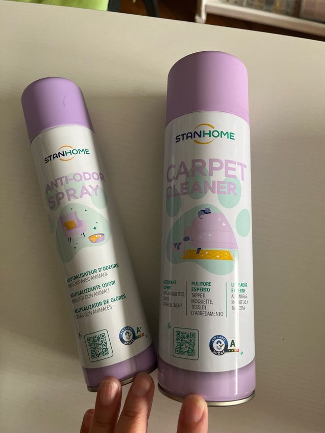 Dettagli del prodottoSet di due prodotti Stanhome per la casa. Uno è uno spray anti-odore e l'altro è un pulitore per tappeti.