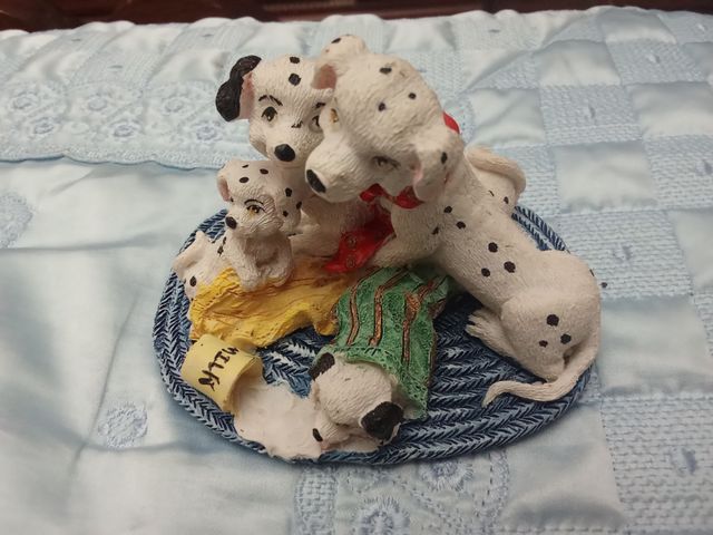 Dettagli del prodottoGraziosa statuetta raffigurante tre cuccioli di dalmata seduti su una base rotonda.