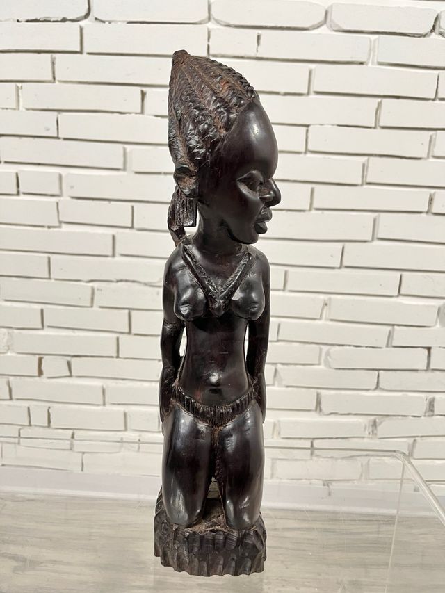 Statua africana intagliata a mano in legno di ebano con patina d’epoca. Arte tribale con significati culturali e rituali. Dimensioni: L9P8H40