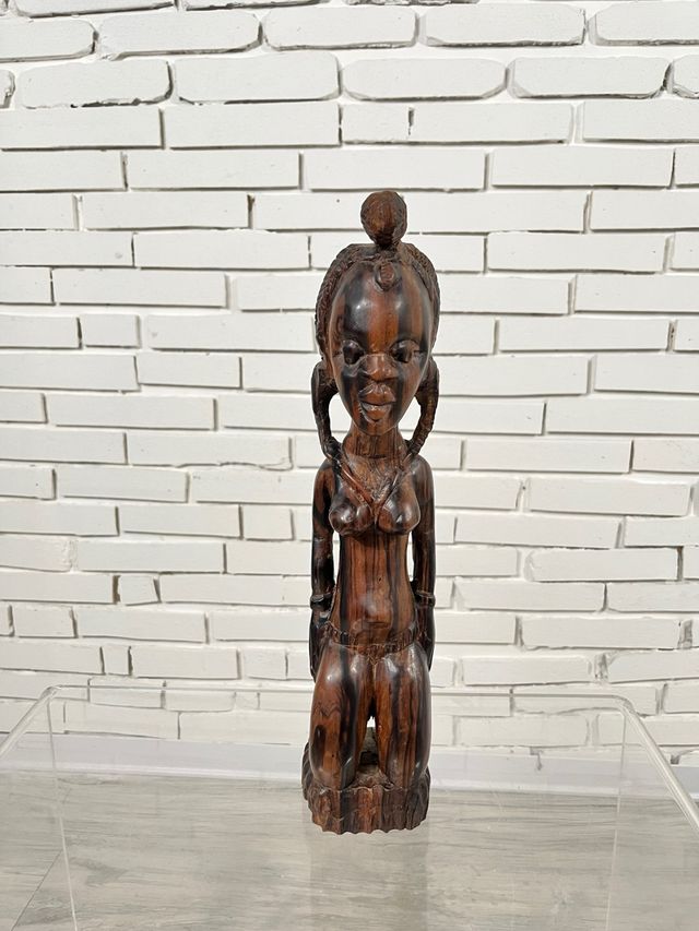 Statua africana intagliata mano in legno di olivo. Arte tribale con significati culturali e rituali. Dimensioni: L9P8H40