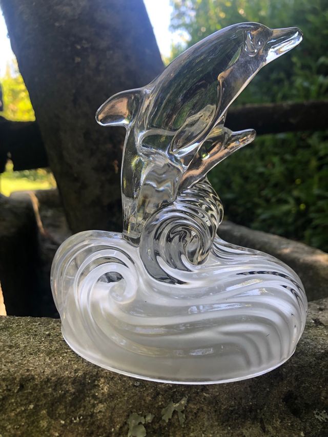 Dettagli del prodottoBellissima statuina di un delfino in cristallo, poggiato su un'onda. Un pezzo elegante e raffinato, perfetto per decorare la tua casa.