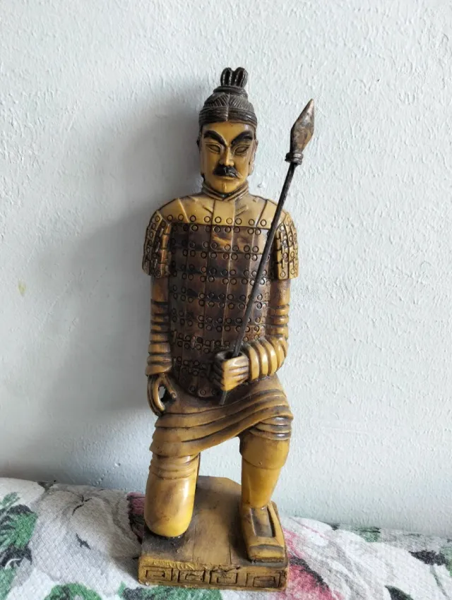 Statua di un guerriero in stile Terracotta. - Dettagli finemente scolpiti. - Materiale simile alla terracotta. - Raffigura un guerriero in armatura con lancia.