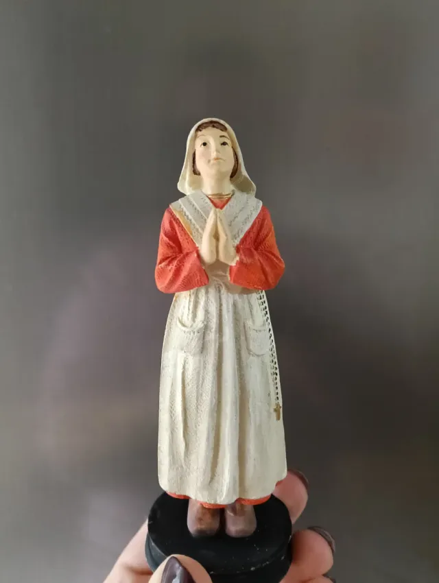 Statua di Santa Bernadette in preghiera. - Dettagli accurati del vestito tradizionale. - Rosari con croce dorata. - Base rotonda nera.