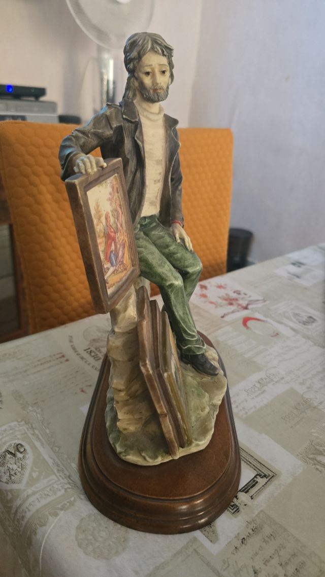 Bellissima statua vintage in ceramica di Capodimonte, raffigurante un artista con un quadro. - Dettagli finemente lavorati. - Base in legno scuro.