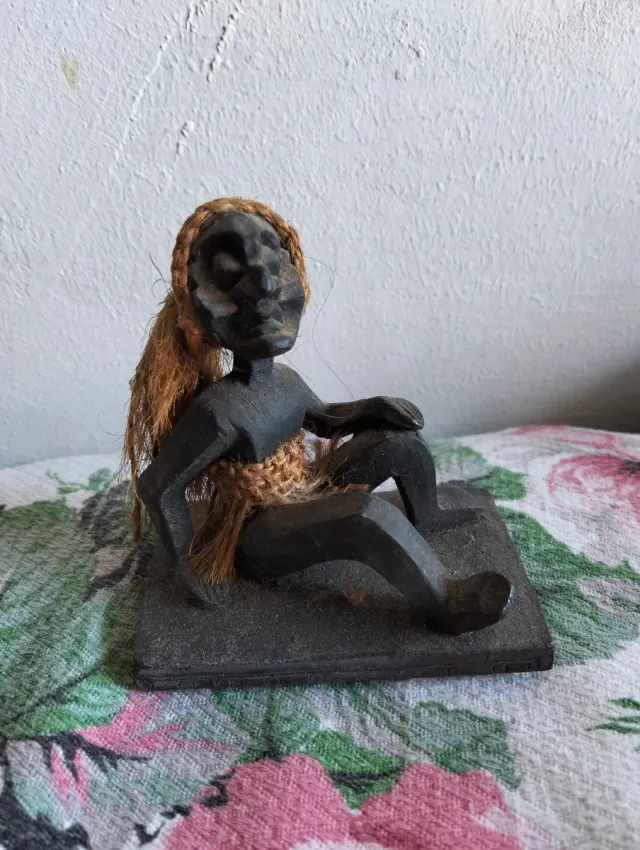 Dettagli del prodottoStatuetta artigianale africana realizzata in legno scuro. La figura è seduta e presenta dettagli unici.