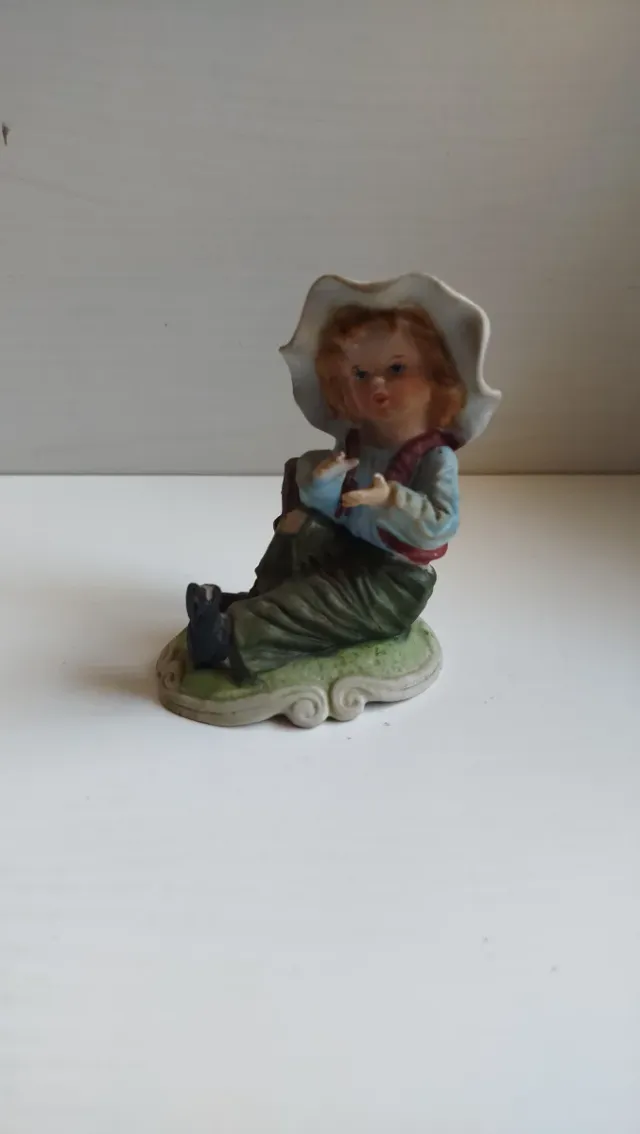 Dettagli del prodottoDeliziosa statuetta vintage raffigurante una bambina con un cappello a falda larga. La figura è seduta su una base decorata.