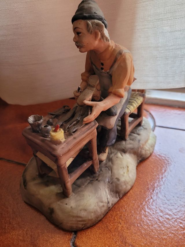 Dettagli del prodottoOriginale Capodimonte raffigurante un Calzolaio all'opera con attrezzi e dettagli definiti a mano.