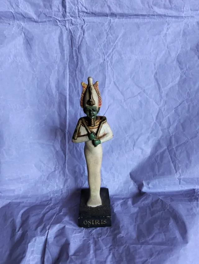 Statuetta raffigurante la divinità egizia Osiride, con copricapo tradizionale e abiti tipici. - Dettagli dipinti a mano. - Base con nome inciso.