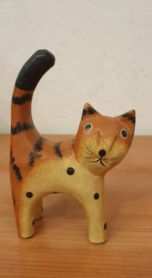 Dettagli del prodottoGraziosa statuetta di gatto in legno, dipinta a mano con dettagli colorati.