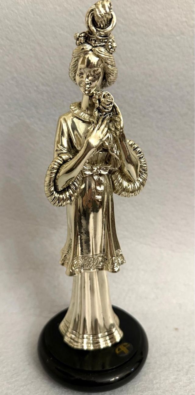 Dettagli del prodottoStatuina in argento 925, firmata dall'artista A. Giannelli. Raffigura una figura femminile con una rosa.