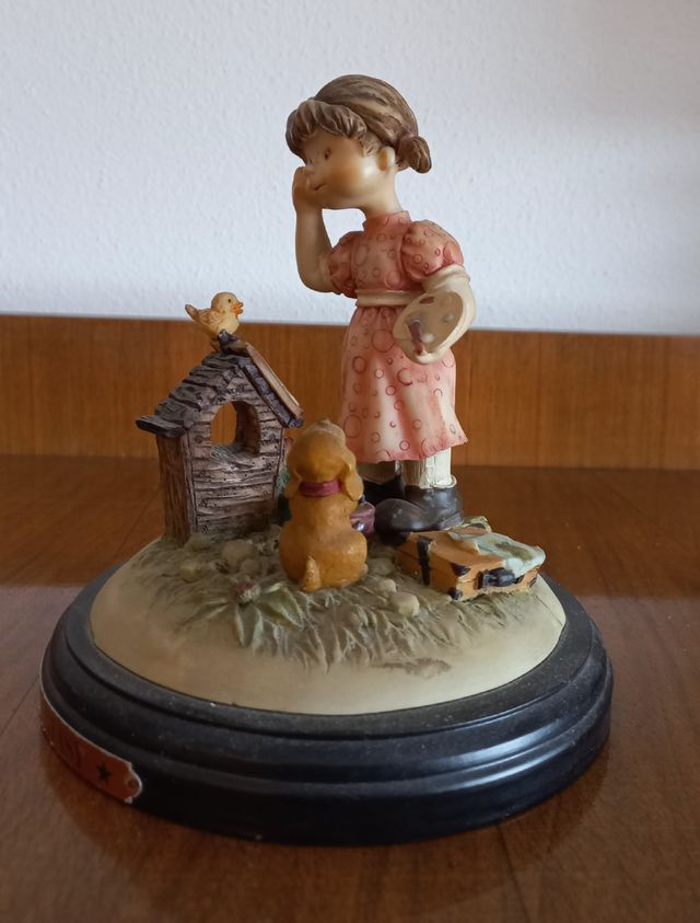Simpatica statuina rappresentante una bambina pittrice con tavolozza e piccolo cagnolino cuccia e uccellino. Dotata di piedistallo. Dimensioni : alt. 15.5 cm diam. 13.5 cm