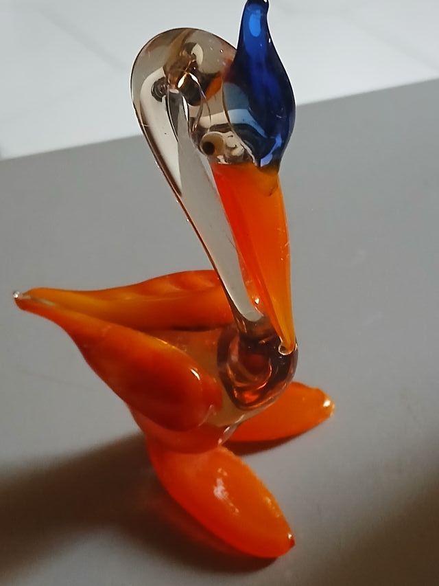 Deliziosa statuina in vetro soffiato, raffigurante un airone con becco blu e corpo arancione. Eseguo imballaggio sicuro e protetto.