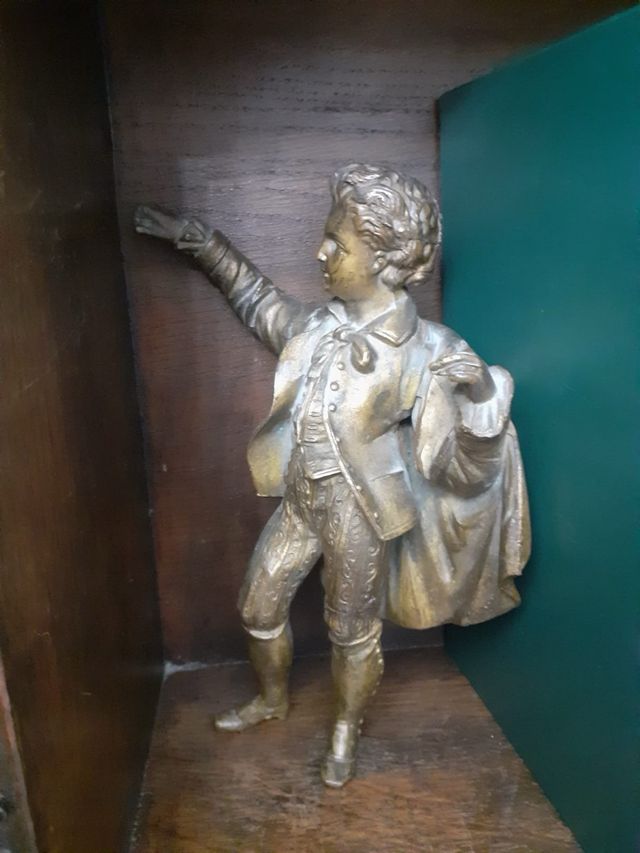 Dettagli del prodottoStatua fine Ottocento inizio Novecento, probabilmente in lega di bronzo, presenta alcune saldature. È alta 18 cm e pesa circa 6 etti. Sotto ai piedi presenta due fori, probabilmente in origine era fissata su di un supporto, mancano parte del pollice e dell'indice di entrambe le mani. Trovata da mio nonno poco dopo la guerra tra le macerie di una chiesa.