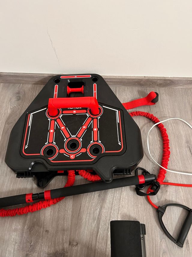 Stazione fitness compatta e pieghevole, ideale per allenamenti a casa. - Design nero e rosso. - Include maniglie e fasce elastiche.