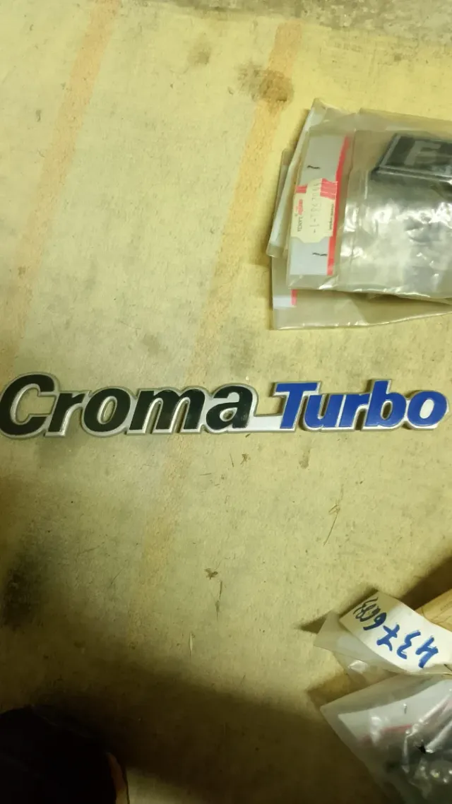 Stemma Croma Turbo per Fiat. - Scritta Croma in grigio metallizzato con contorno nero. - Scritta Turbo in blu metallizzato con contorno bianco.