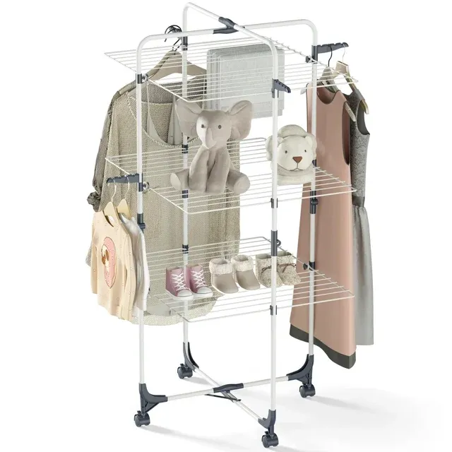 Dettagli del prodottoStedibiancheria SYKIARIOL pieghevole a tre livelli con ruote e 4 ganci per uso interno ed esterno per biancheria da letto, vestiti, calzini ,sciarpe . colore bianco Misure del prodotto