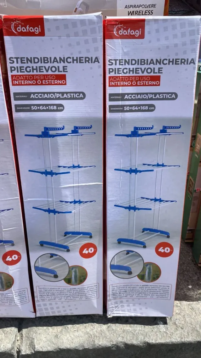 Dettagli del prodottoStendibiancheria pieghevole Dafagi, adatto per uso interno o esterno. Realizzato in acciaio e plastica.