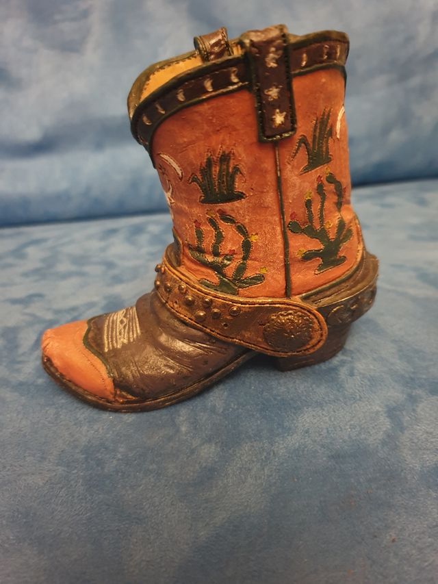 Dettagli del prodottoTexano in miniatura Perfetto in ogni particolare, dalla ghetta ai ricami alle cuciture in punta..dipinto a mano. Per chi ama i texani veri! Un soprammobile unico ed originale. Alto 10cm. Misure del prodotto