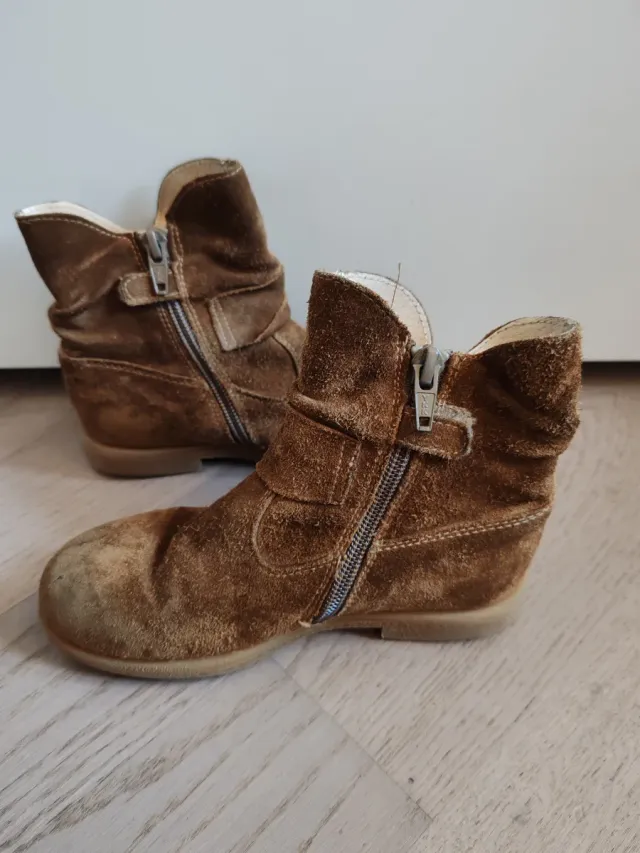 Stivaletti in camoscio vera pelle marrone per bambina. Made in italy. - Chiusura laterale con zip. - Dettaglio cinturino con fibbia.