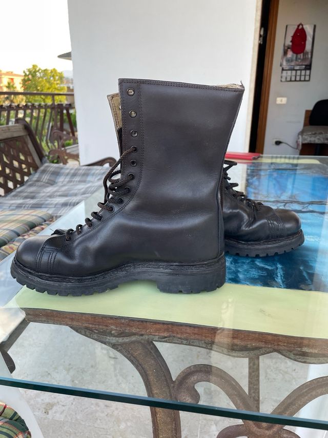 Stivali alti in pelle marrone scuro, ideali per il lancio. - Chiusura con lacci. - Punta rinforzata. - Suola spessa e resistente.derivazione militare ! TG 42