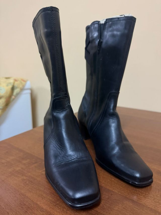 Vendo bellissimi stivali neri in vera pelle, numero 36. Un modello classico ma grintoso, caratterizzato dalla punta squadrata e un tacco medio molto comodo, perfetto per l'uso quotidiano o per un look da ufficio sofisticato.