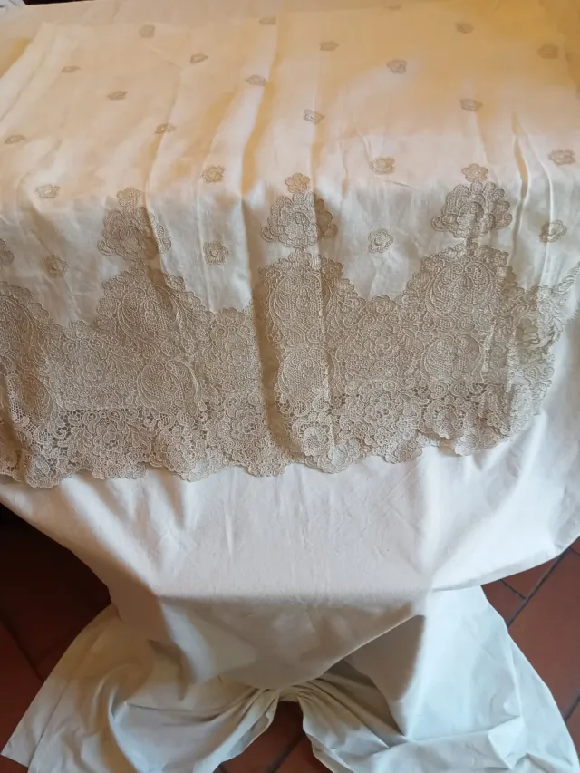 Bellissimo tessuto vintage in lino con dettagli in macramè. - Motivo floreale ricamato. - Bordi in pizzo macramè. - Tonalità avorio/beige.