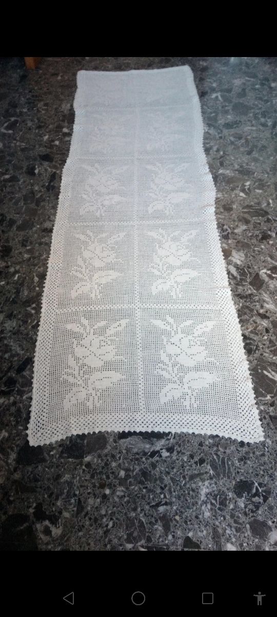 Striscia ad uncinetto totalmente fatta a mano in cotone bianco motivi di rose. La condizione Nuovo. Misura 185 x 58