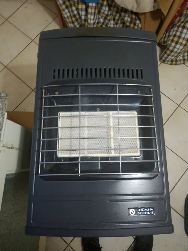 Stufa a metano marca Olimpia Splendid. - Colore grigio scuro. - Griglia protettiva frontale. - Design moderno.