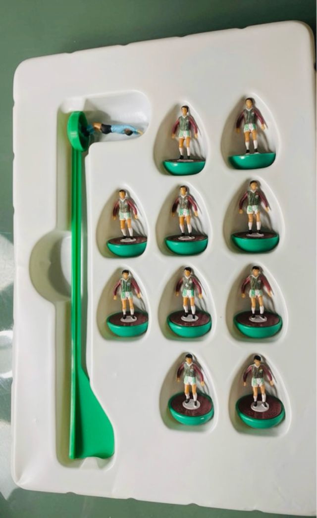 Set Subbuteo Iw Fluminense del año 1984. - Giocatori con maglia verde e bordeaux. - Base verde. - Include 11 giocatori nuovi. - Scatola leggermente usurata