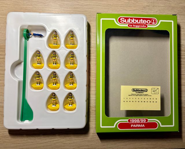 Dettagli del prodottoVendo splendida squadra originale Subbuteo La Leggenda - Parma 1998/99. La squadra è in Perfetto Stato, mai utilizzata, nessun calciatore presenta alcuna rottura, piegatura o incollatura, come visibile in foto.