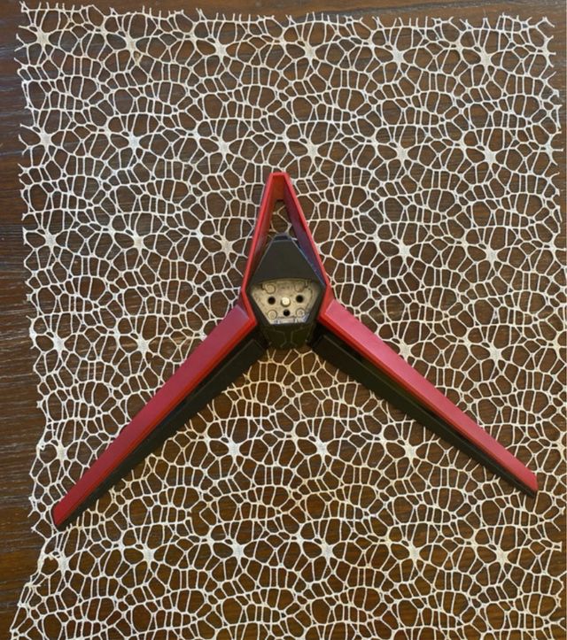 Supporto per monitor dal design moderno, con finiture rosse e nere. - Base a forma di V. - Parte centrale in plastica nera. - Finiture rosse lucide.