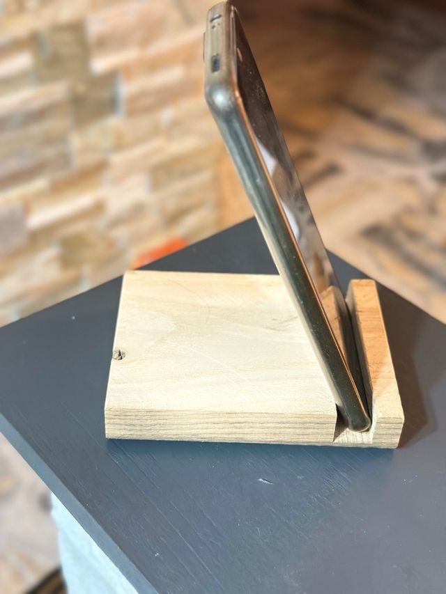 Supporto in legno per tenere il telefono in posizione verticale. Ideale per guardare video o fare videochiamate. - Materiale: legno naturale. - Design semplice e funzionale.
