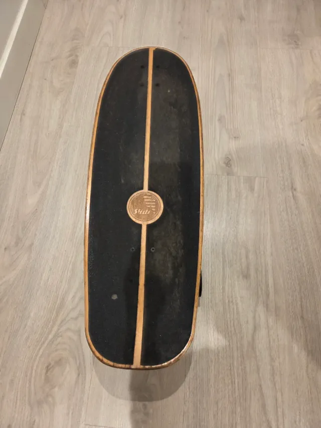 Surfskate del marchio Sancheski. - Tavola con spugna nera. - Design con due linee di legno. - 79 cm di lunghezza.