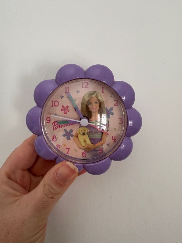 Dettagli del prodottoSveglia da comodino con un design a forma di fiore viola. L'immagine sul quadrante presenta Barbie con un cucciolo.