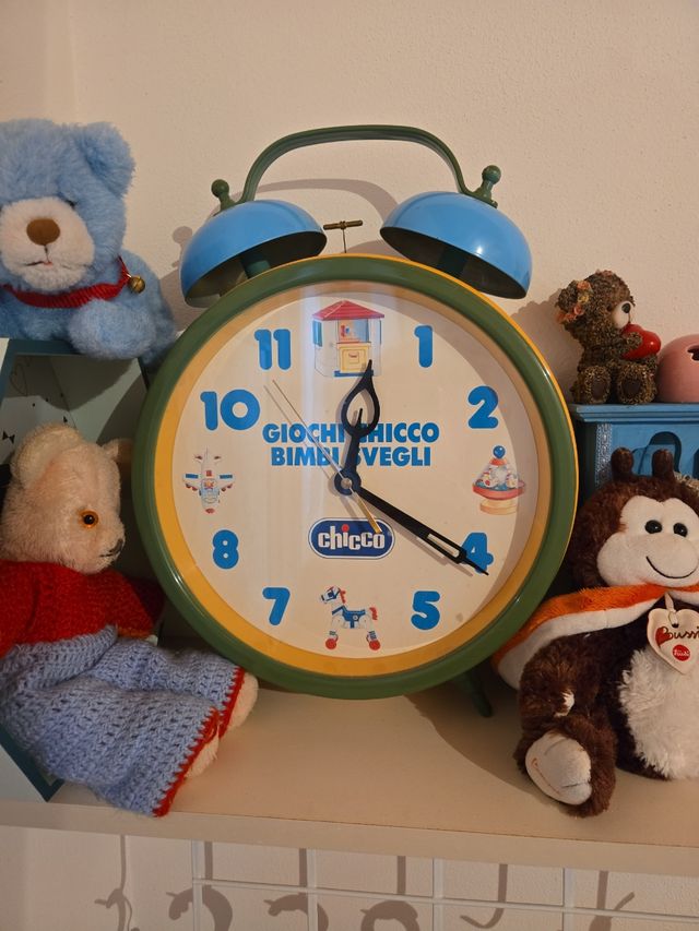 Dettagli del prodottoSveglia da tavolo Chicco, modello Bimbi Svegli, con un design colorato e divertente.