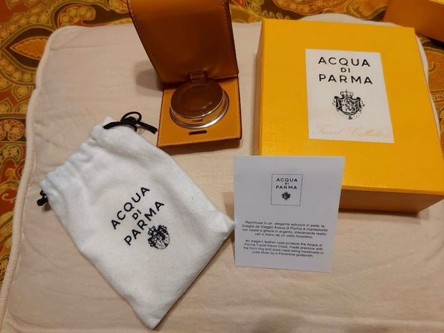 Sveglia da viaggio Acqua di Parma in argento e vera pelle, tenuta in condizioni eccellenti come nuova ✅; un accessorio elegante e ricercato, ideale per collezionisti o per chi desidera aggiungere un tocco di lusso ai propri viaggi.
