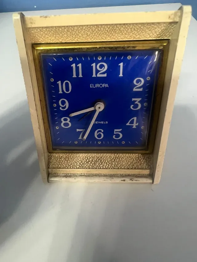 Sveglia da tavolo Europa con movimento a 7 rubini. Risalente agli anni 70,non funzionante - Quadrante blu. - Cornice dorata e finiture color crema. - Design classico.