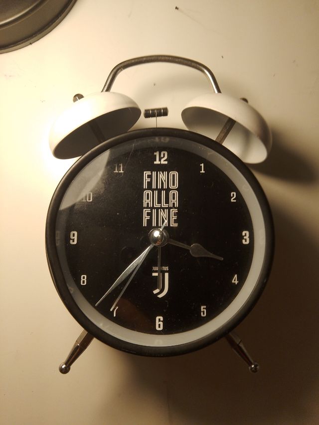 Sveglia da tavolo con il logo della Juventus e la scritta Fino alla fine. - Design classico a due campane. - Quadrante nero con numeri bianchi.