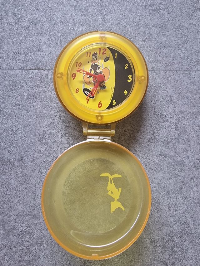 Dettagli del prodottoOrologio sveglia vintage a forma di orologio da tasca dei Looney Tunes. È di colore giallo e presenta un'immagine di Paperino in bicicletta.