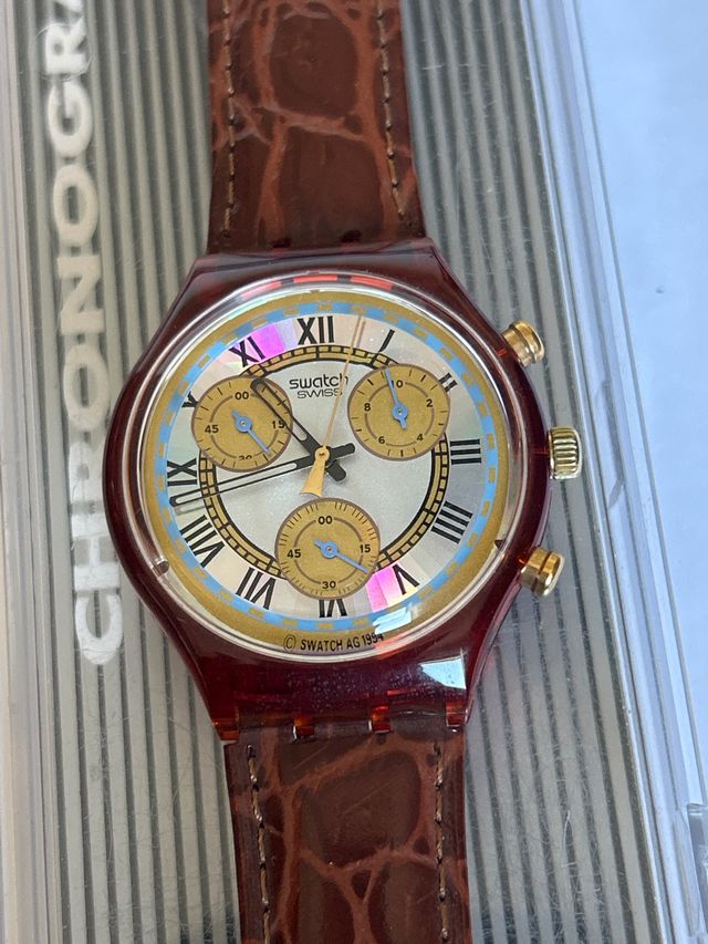 Dettagli del prodottoOrologio Swatch Chronograph con cinturino in pelle marrone.