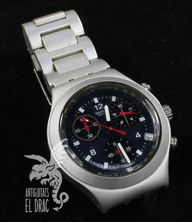 Dettagli del prodottoOrologio da polso Swatch Irony con quadrante blu e dettagli rossi.